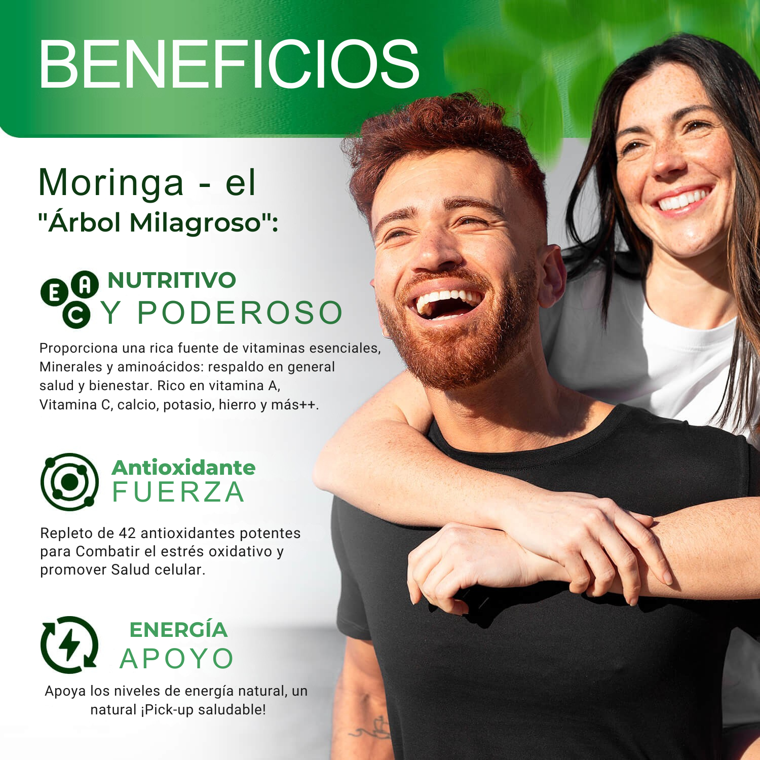 Es un suplemento natural en cápsulas formulado con 800 mg de polvo puro de hoja de moringa por dosis (2 cápsulas). Una opción completa para incorporar los beneficios de este superalimento a tu rutina diaria, sin necesidad de preparar infusiones o batidos.