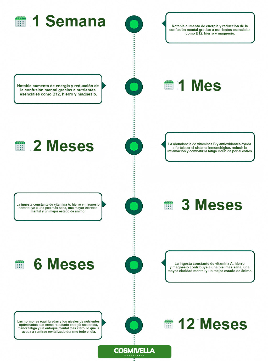 Muchas personas notan un aumento de energía y mejor digestión dentro de la primera semana. Los beneficios más completos se observan después de 3 a 4 semanas de uso continuo.