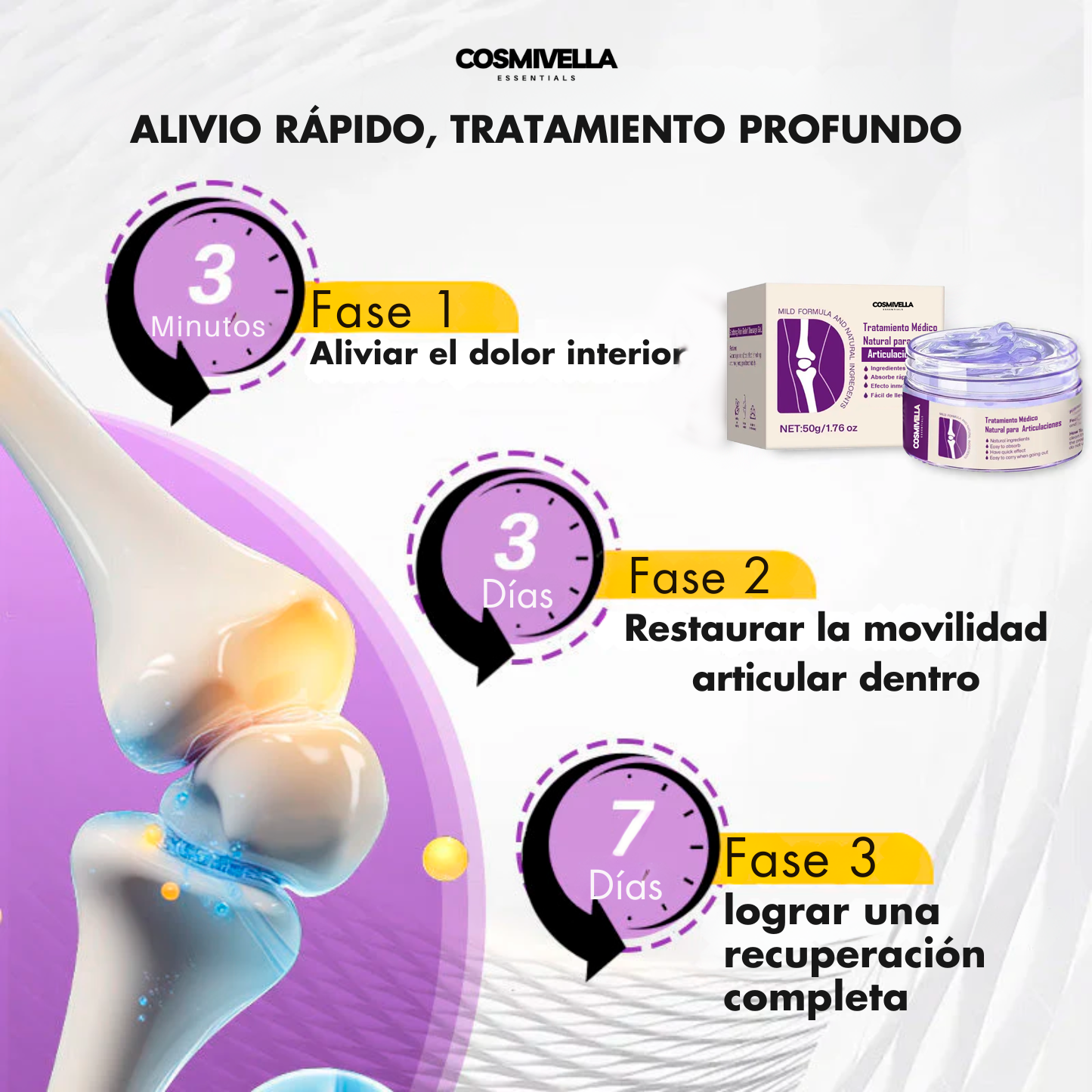Los efectos comienzan a notarse desde la primera aplicación, con reducción del dolor y mejora en la movilidad. Con uso constante, los resultados se vuelven más duraderos en aproximadamente 1-2 semanas.